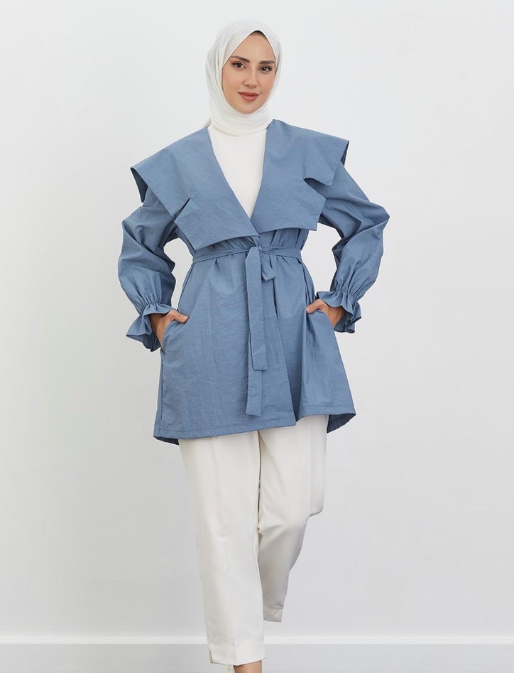 kemerli, uzun kollu, bol kesim kısa denim trençkot. Notlu yaka detayı ve günlük sokak tarzı için uygundur.