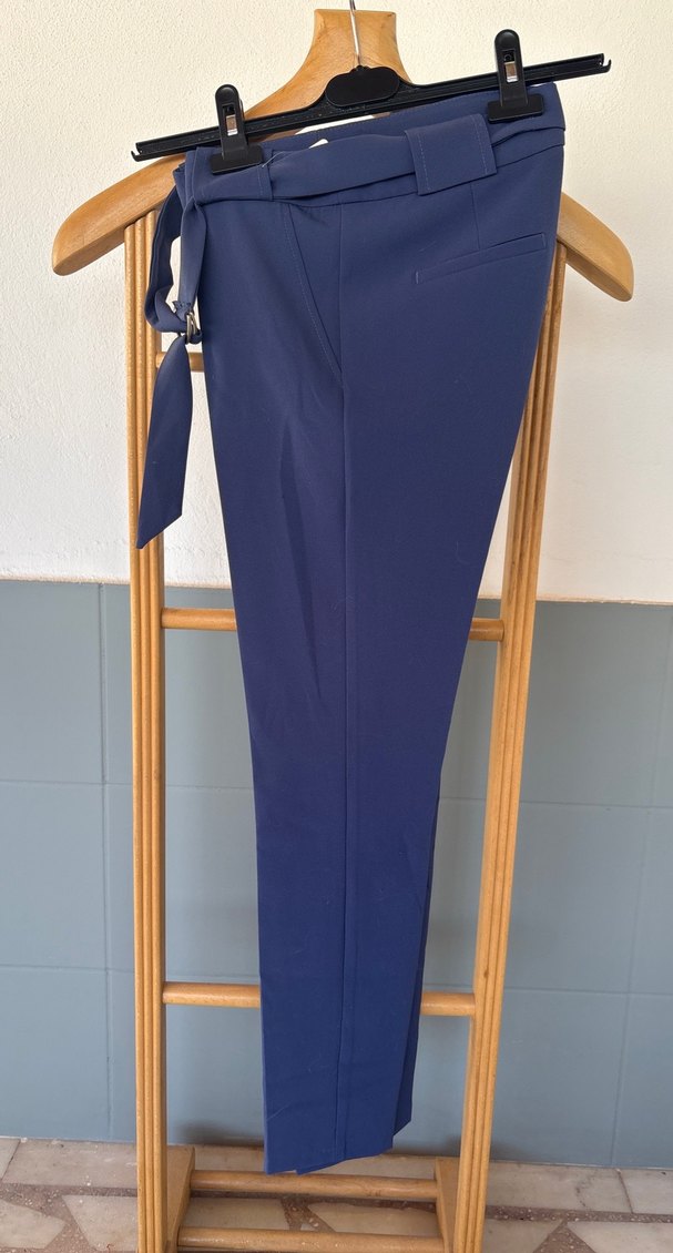 Kadınlar için koyu mavi renkte, kemerli ve normal kesim kumaş pantolon. Midi boyda, ofis ortamına uygun sade ve normcore tarzda, sentetik dokulu kumaştan. Bir kaç yerinde ip kaçığı var