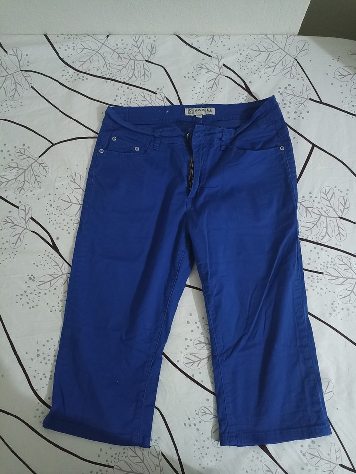 Kadınlar için mavi denim, kemerli ve parlak görünümlü midi boy jean. Rahat kesimiyle günlük ve sokak stiline uygundur.