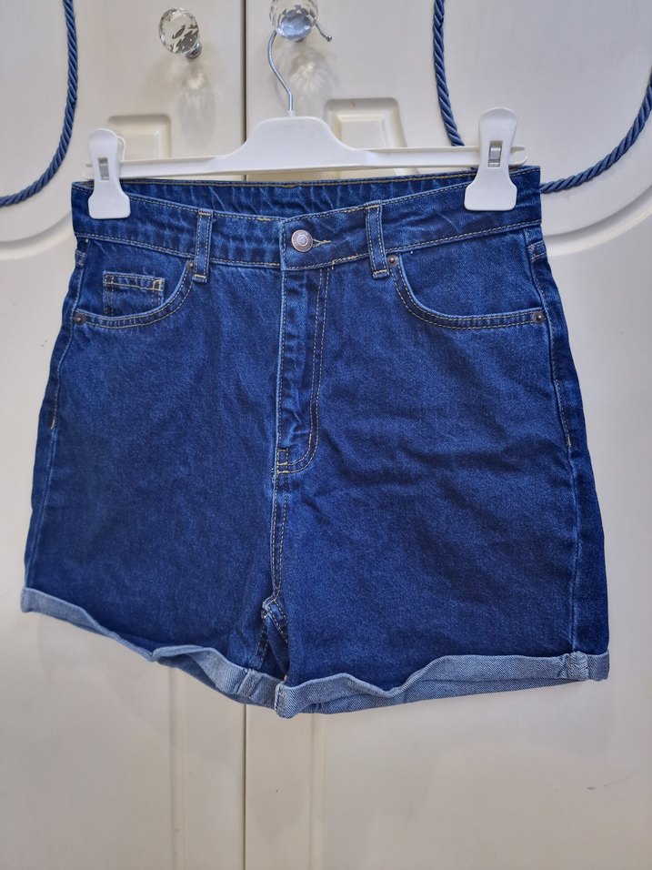 Koyu mavi renkli, kemerli, bol kesim mini denim şort. Günlük kullanım için uygun, desen içermeyen rahat ve sokak tarzı bir ürün.