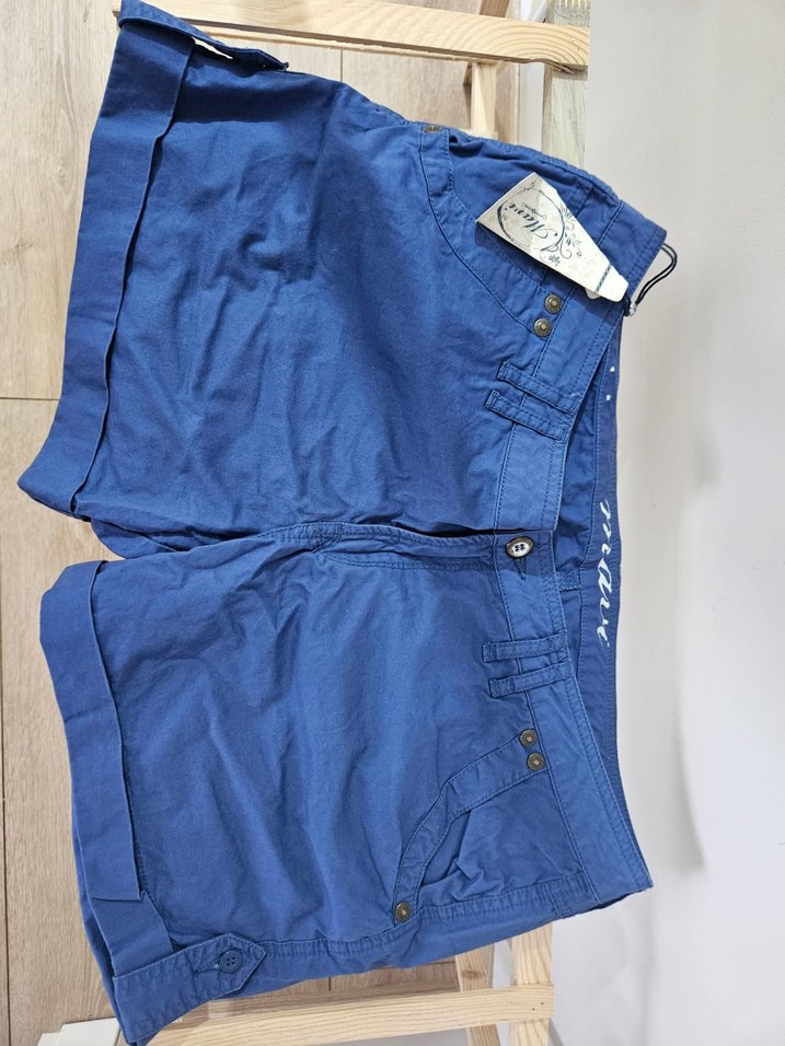 Mavi renkli, kemerli, bol kesim mini denim şort. Parlak görünümlü, desen içermeyen, günlük açık hava sokak stiline uygun.