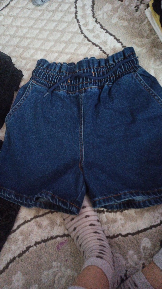 Kadınlar için kemerli, bol kesim, koyu mavi mini kot şort. Rahat ve desensiz, günlük kullanım için uygun.