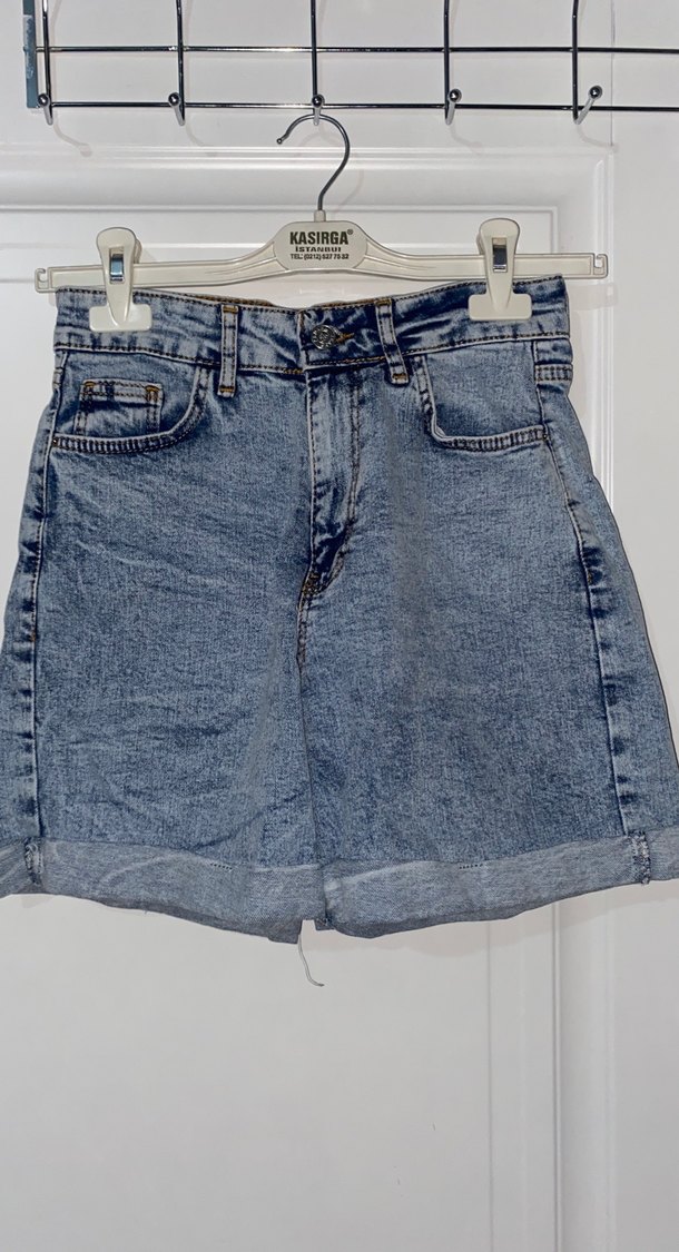 Kemerli, bol kesim mavi kot mini şort. Rahat ve günlük kullanım için uygun, sokak stiline uygun tasarım.