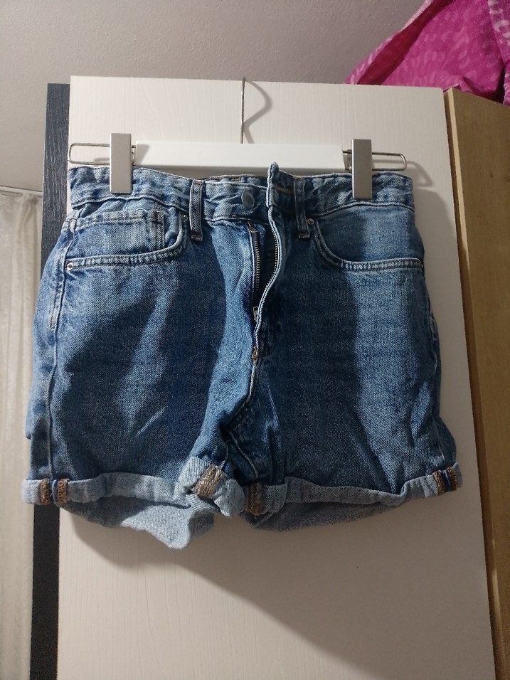Kadınlar için bol kesim, kemerli mavi kot şort. Kısa boy ve günlük kullanıma uygun rahat sokak stili. hiç kullanılmadı