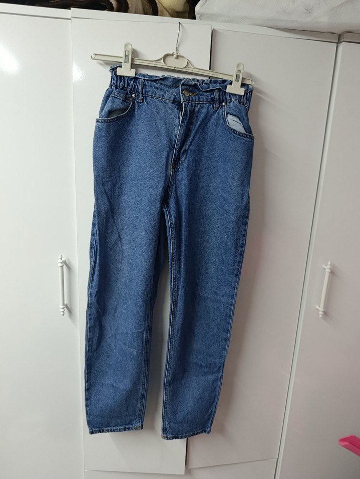 Kadınlar için kemerli ve salaş kesime sahip mavi kot pantolon. Normal boyda, gündelik sokak stiline uygun rahat bir modeldir. Unpatterned ve dayanıklı kot kumaştan üretilmiştir.