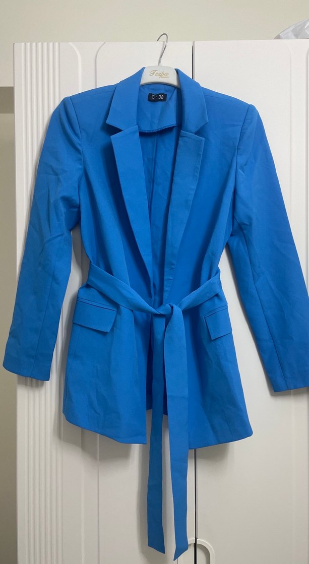 Kadınlar için kemerli, kesik yakalı, uzun kollu mavi blazer. Düzenli kesim ve midi boy, ofis ve günlük kullanıma uygun. Yumuşak ve sıcak dokulu kumaş rahatlık sağlar.