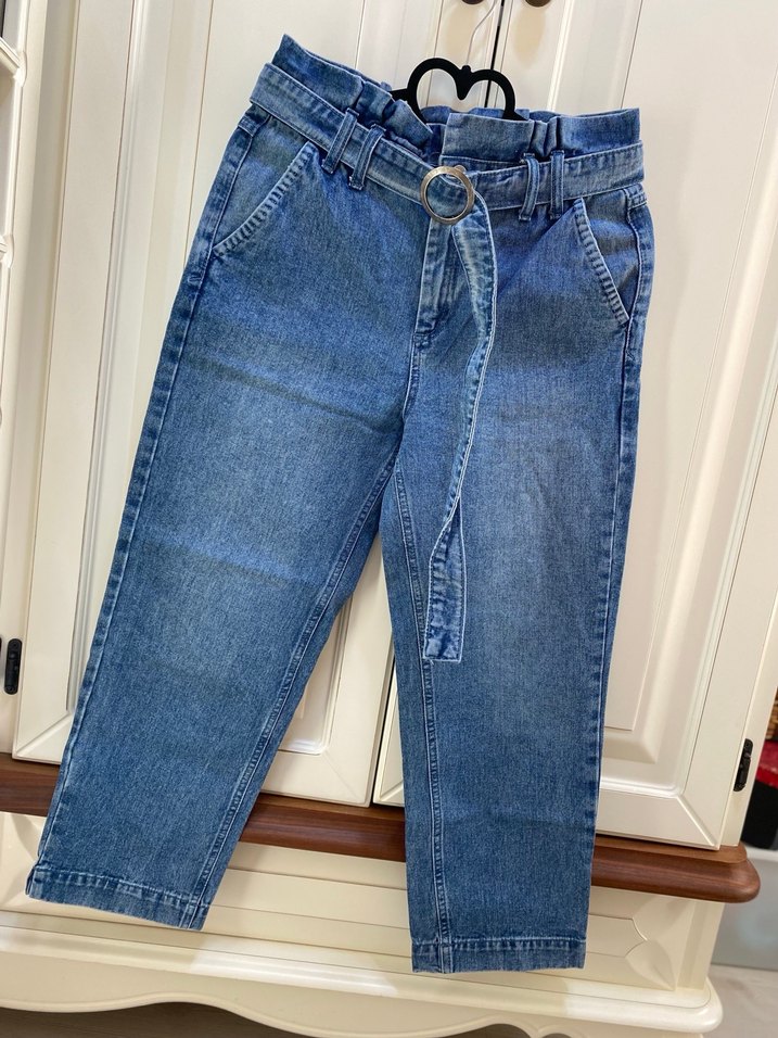 Mavi denim kumaştan, kemerli ve bol kesim kadın kot pantolon. Normal boy ve midi kesimiyle günlük rahat kullanıma uygundur.