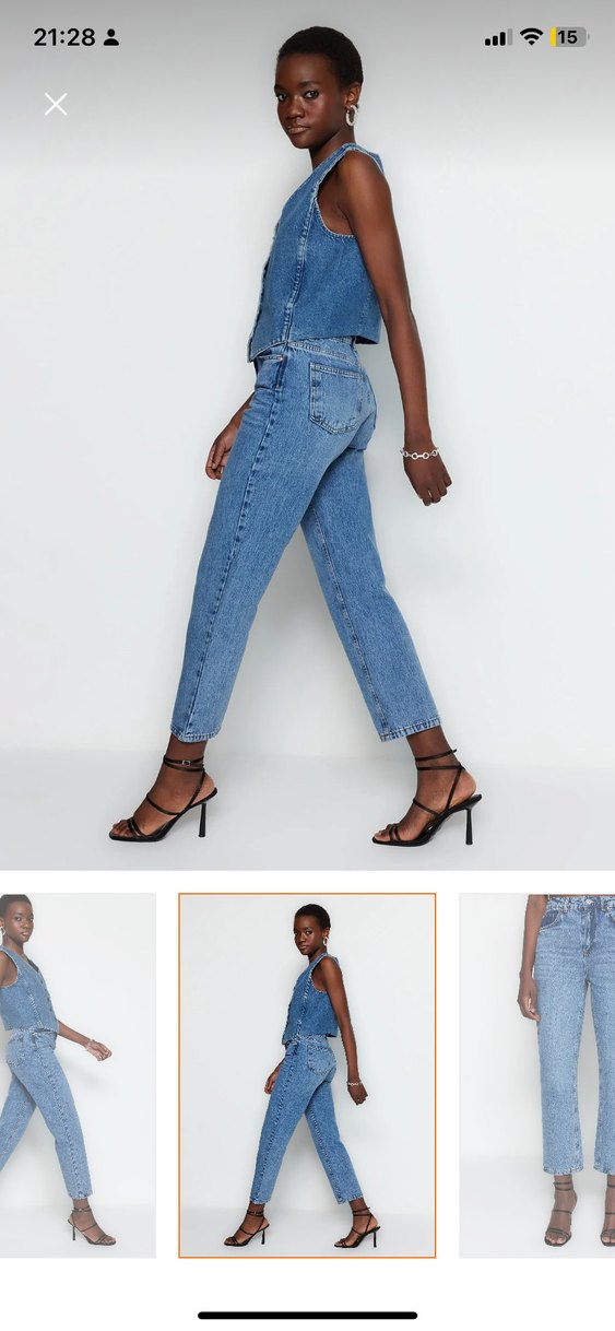 Kadınlar için mavi denim pantolon, regular fit ve kemerli. Parlak yüzeyli, midi boyda, günlük sokak modasına uygun. Hiç giyilmedi iade tarihi geçtiği için iade edemedim