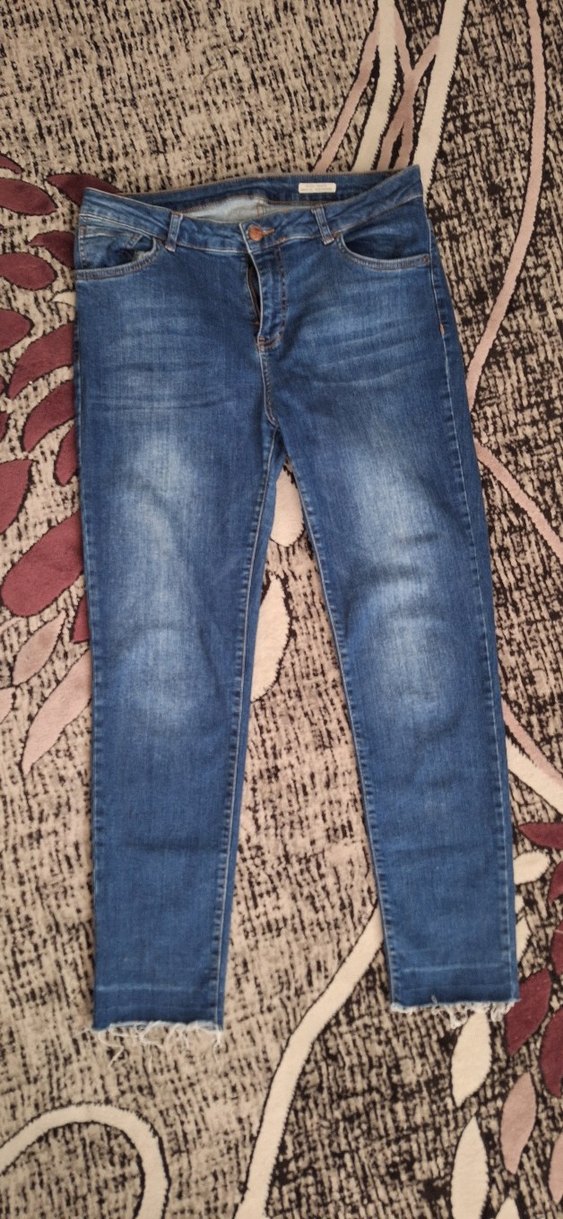 Kadınlar için mavi denimden yapılmış, kemerli ve regular fit midi boy pantolon. Günlük sokak stili için uygundur.