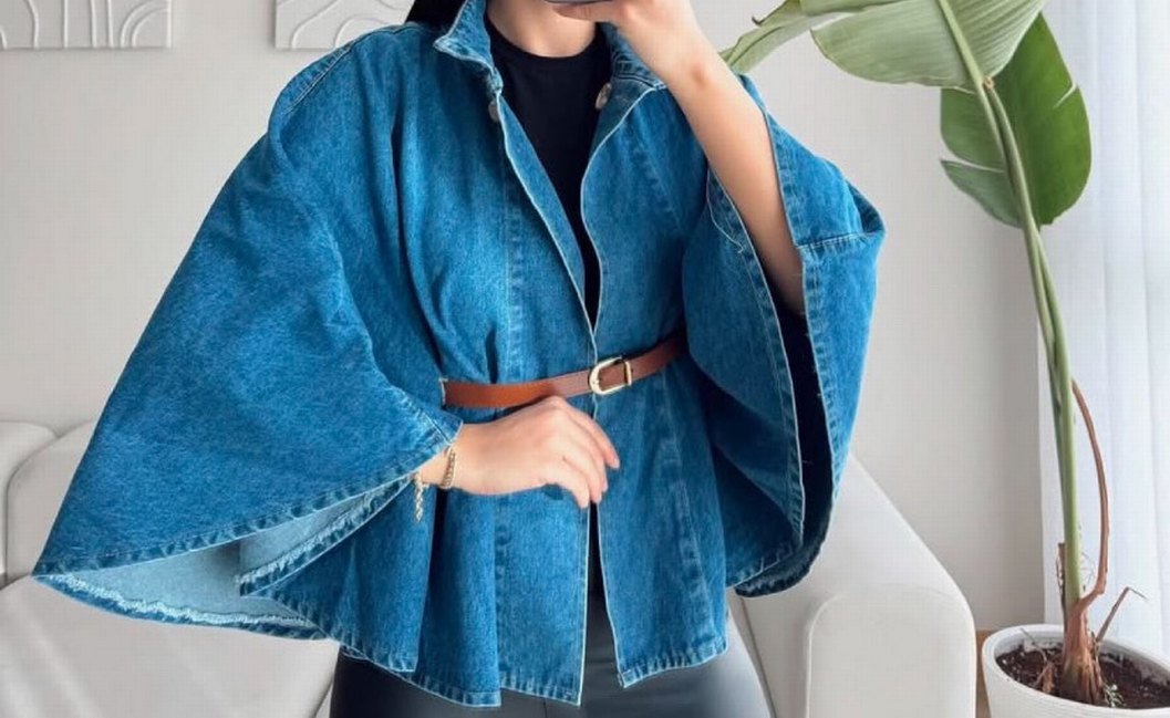 Kadınlar için mavi renkli, kemerli ve salaş kesim denim ceket. Notlu yakalı ve askılı kollu, günlük kullanıma uygundur.