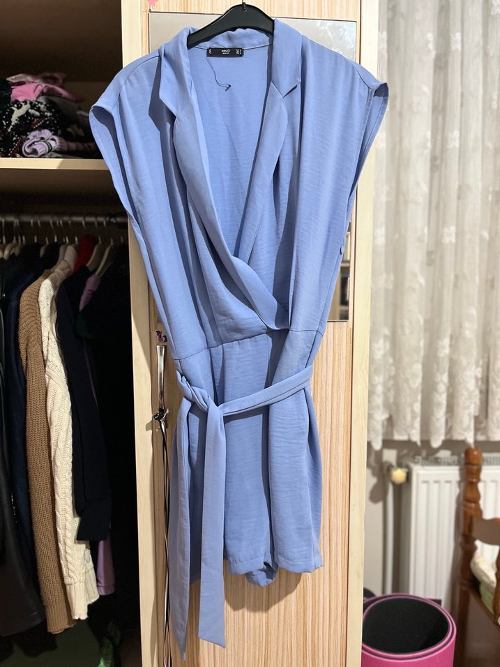 Mavi renk kemerli şortlu elbise. Yandan fermuarlıdır