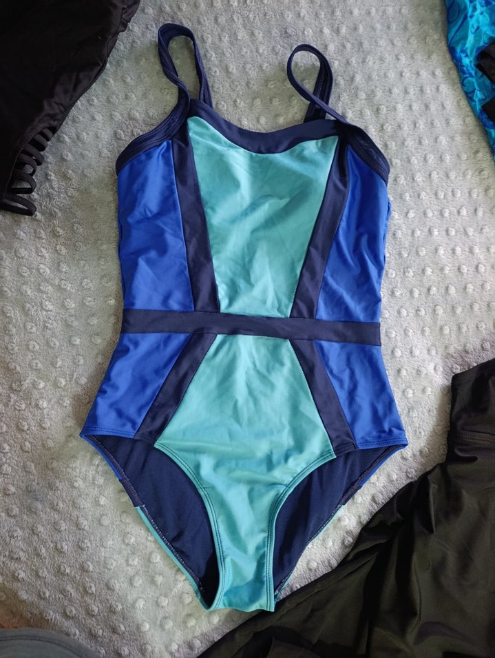 Kemerli ve strappy kollu, koyu mavi ve yeşil tonlarında, sportif ve şık görünüme uygun kadın mayo. not adet fiyatı dır