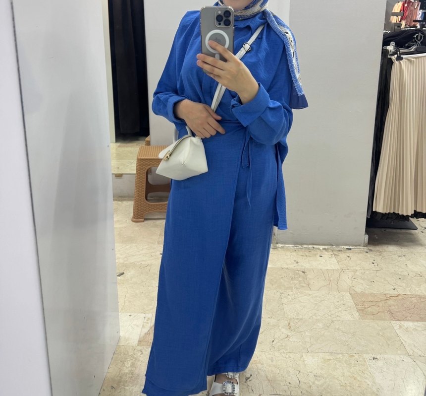 Kadın mavi keten takım, bol kesim, yüksek yakalı ve uzun kolludur. Kemerli ve uzun boy, günlük rahat ve trend bir görünüm sunar.