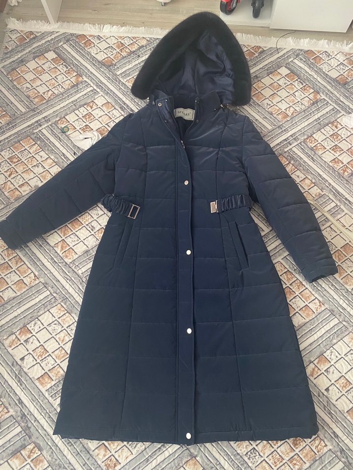 Kadın Mavi Kemerli Uzun Kışlık mont