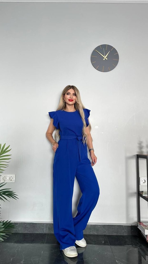 Kadınlar için kemerli, kısa kollu ve yuvarlak yakalı uzun tulum. Parlak mavi renkte, sentetik kumaştan, ofis ve günlük kullanıma uygun şık bir model.