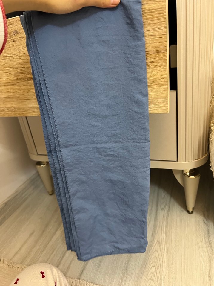 Keten kumaştan, mavi renkte, drapeli tasarıma sahip kadın şalı, minimalist ve normcore stilini yansıtıyor.