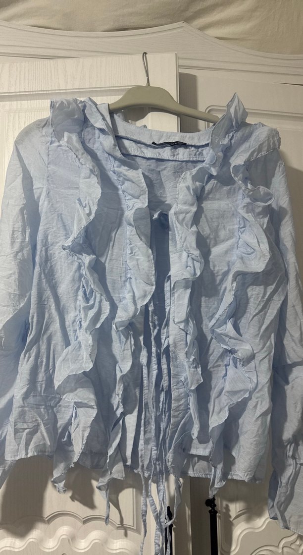 Mavi renkte, keten kumaştan üretilmiş, bol kesim kadın gömleği. Uzun kollu, yakalı ve fırfır detaylıdır. Günlük kullanıma uygundur.