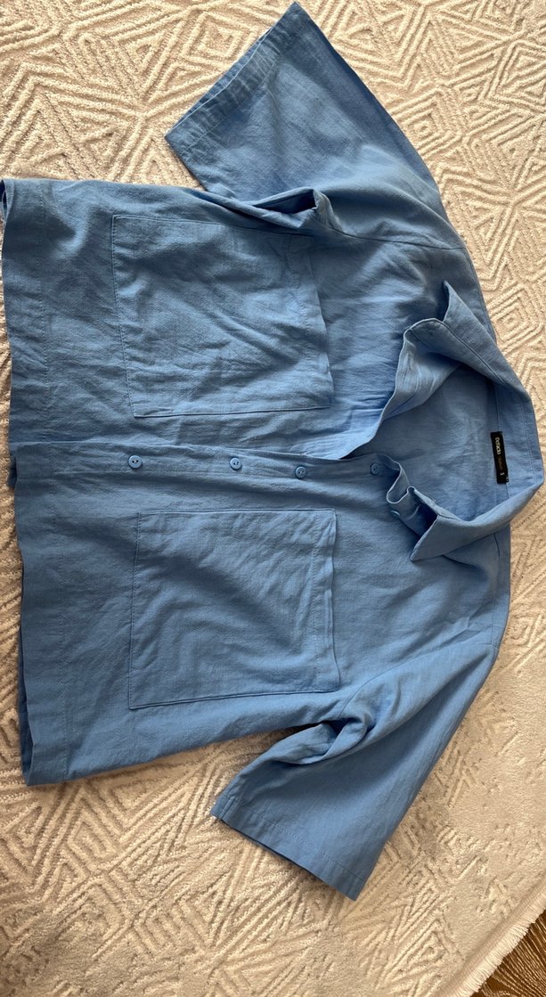 Mavi keten gömlek, yakalı, kısa kollu ve düğmeli. Bol kesim ve normal uzunlukta, gündelik kullanıma uygun. İki ön cep detayına sahip.