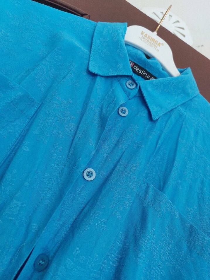 Canlı mavi keten kumaştan, kısa kollu ve düğmeli, yakalı, bol kesim kadın gömleği. Günlük sokak stiline uygun.