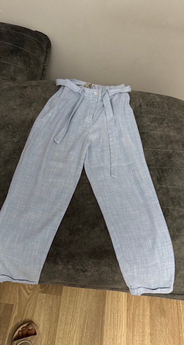 Mavi keten kumaştan, bol kesim, kemerli ve midi boy kadın pantolon. Rahat ve şık günlük sokak stili için uygundur.