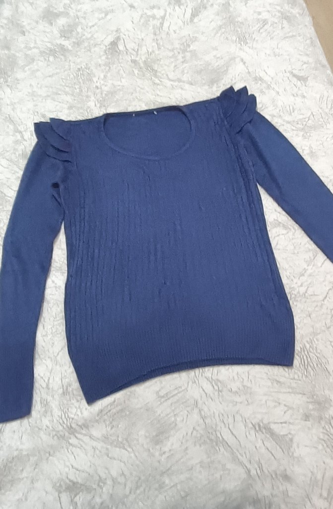 Mavi, keten kumaştan, uzun kollu, yuvarlak yaka ve omuzlarda fırfır detaylı rahat kesim kazak. Günlük sokak stiline uygun.