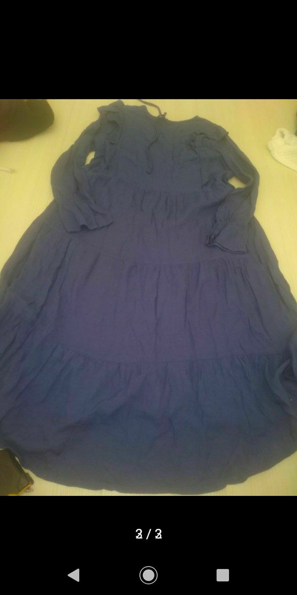 Koyu mavi keten kumaştan, uzun kollu, salaş kesim ve fırfır detaylı, yuvarlak yakalı bohem tarzda günlük elbise.