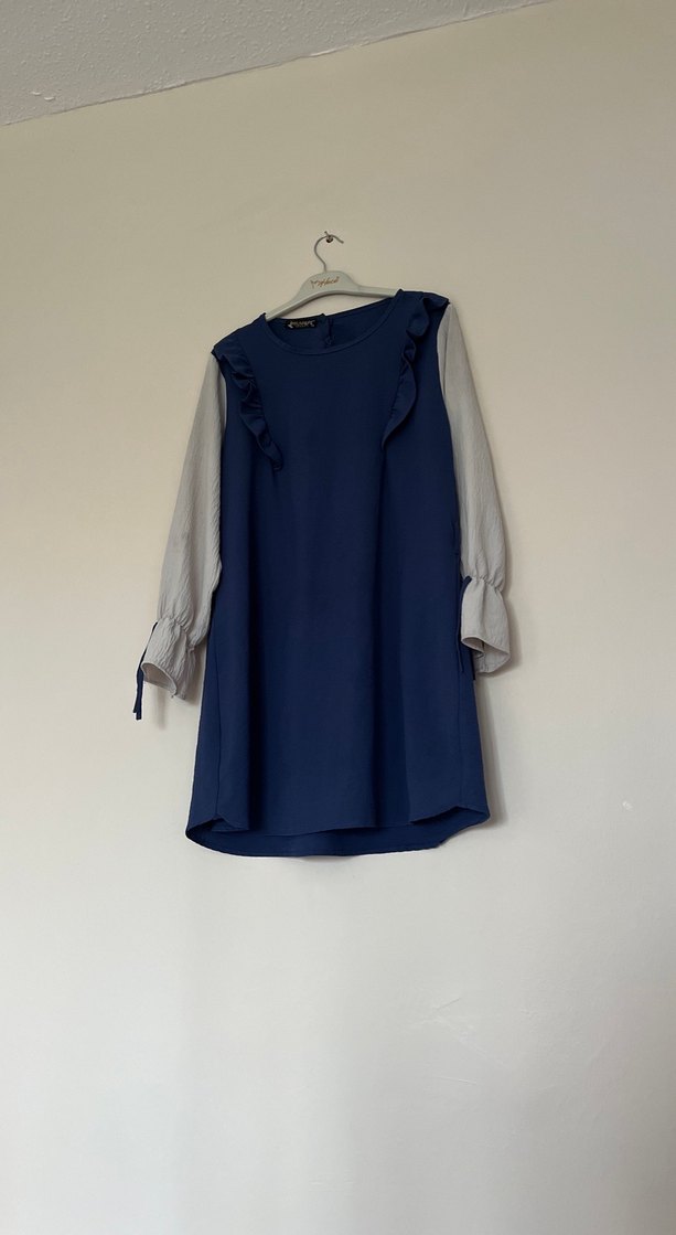 Gri uzun kollu, fırfır detaylı mavi keten tunik. Salaş kesim ve yuvarlak yakalı, günlük kullanıma uygun.