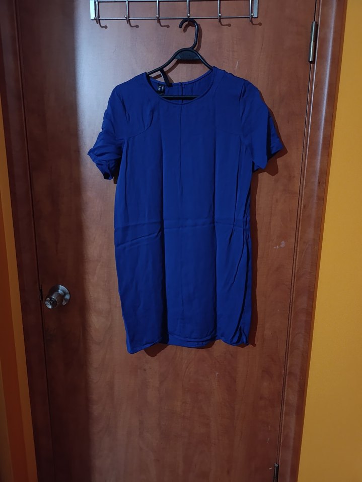 Kadınlar için kısa kollu, bisiklet yaka ve bol kesim keten Koyu mavi renkte, desensiz ve günlük kullanım için uygundur.