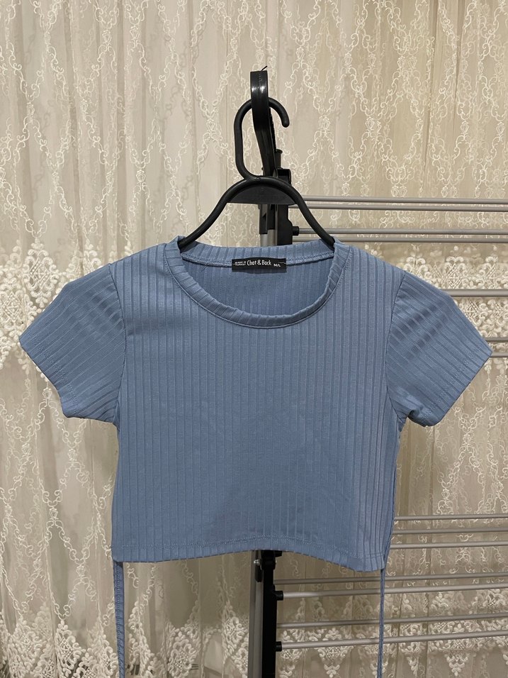 Mavi denim kumaştan, kısa kollu, yuvarlak yaka ve pileli dokulu, vücuda oturan crop top.