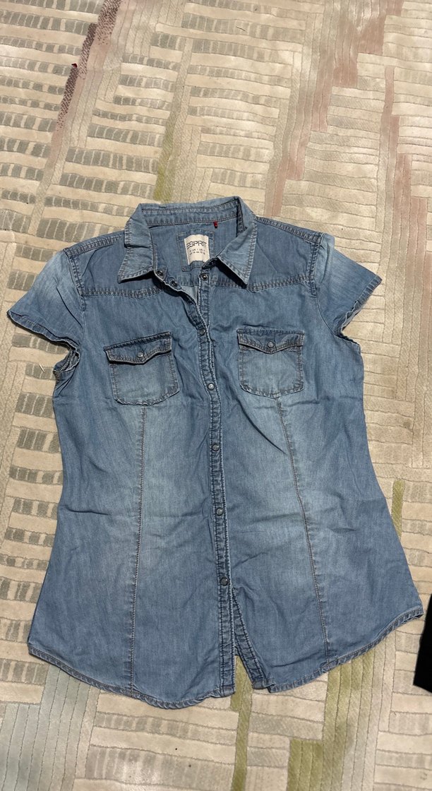 Kadınlar için fitted kesim, kısa kollu, yakalı ve düğmeli mavi denim gömlek. İki göğüs cebi ve günlük rahat sokak stili içerir.