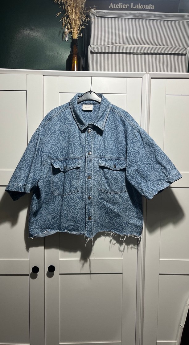 Kadınlar için kısa kollu, düğmeli, bol kesim ve yakalı denim ceket. Mavi ve gri tonlarda batik desenli, midi boy, günlük rahat kullanıma uygun.
