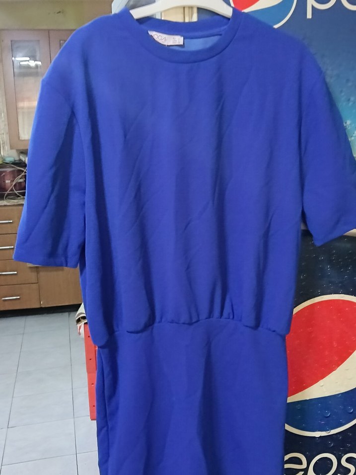 Kadın mavi midi elbise, kısa kollu, yuvarlak yaka ve salaş kesime sahip. Sentetik kumaştan üretilmiş, renkli ve günlük sokak stili için uygun.