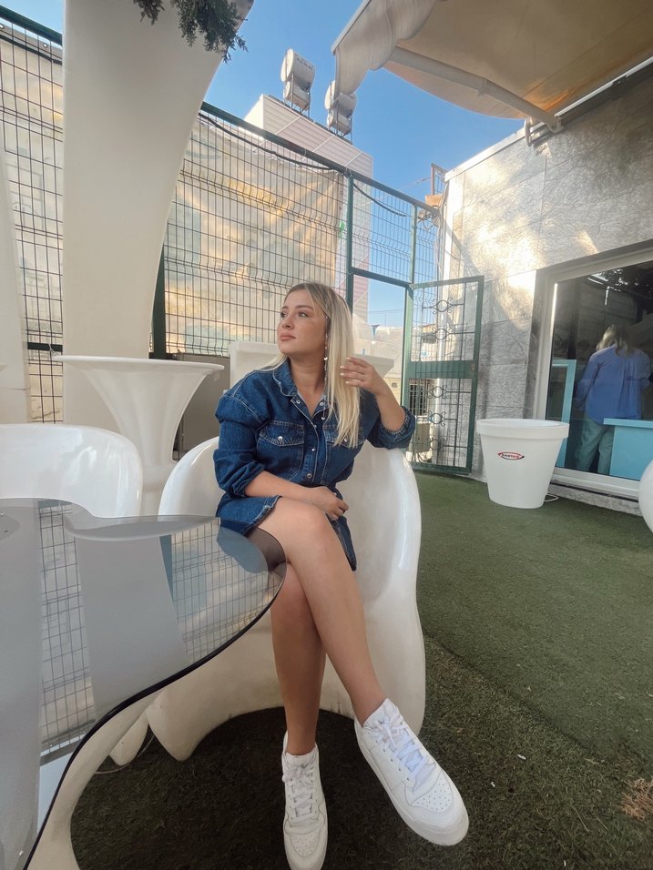 Kadın mavi kot jean elbise kısa ve bol kesim, yaka ve batik desenli, rahat sokak stili için uygun.