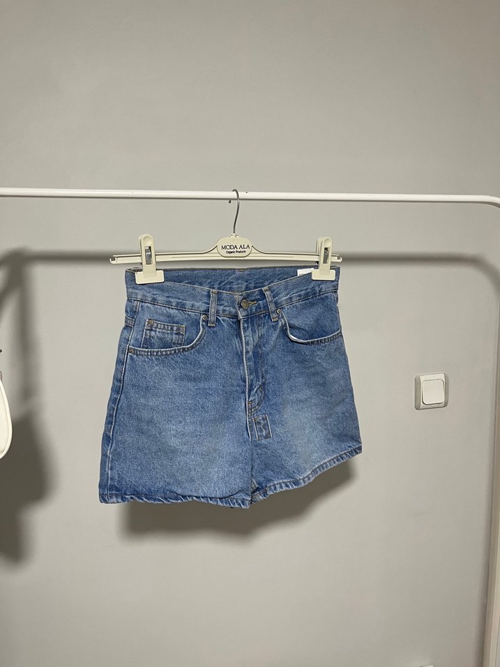 Açık mavi kot şort, bol kesim bel ile günlük kullanıma uygun. Mini boyda, desensiz ve rahat sokak stili için ideal.