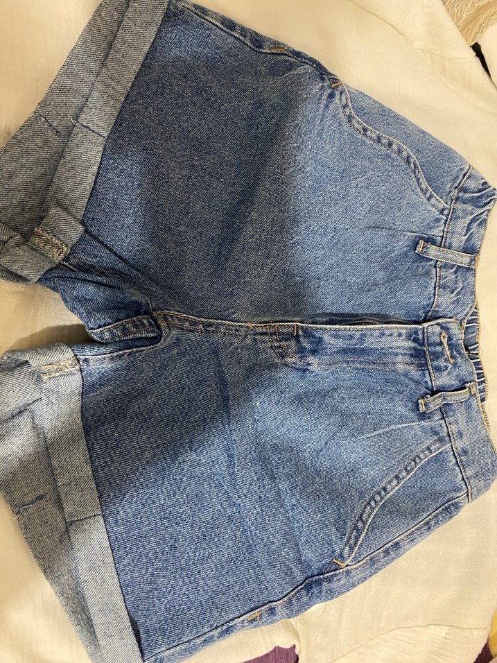 Kadınlar için bel kemerli, bol kesim kot şort. Kısa mini boyda, koyu mavi renkte, desensiz, günlük rahat stil için uygun.