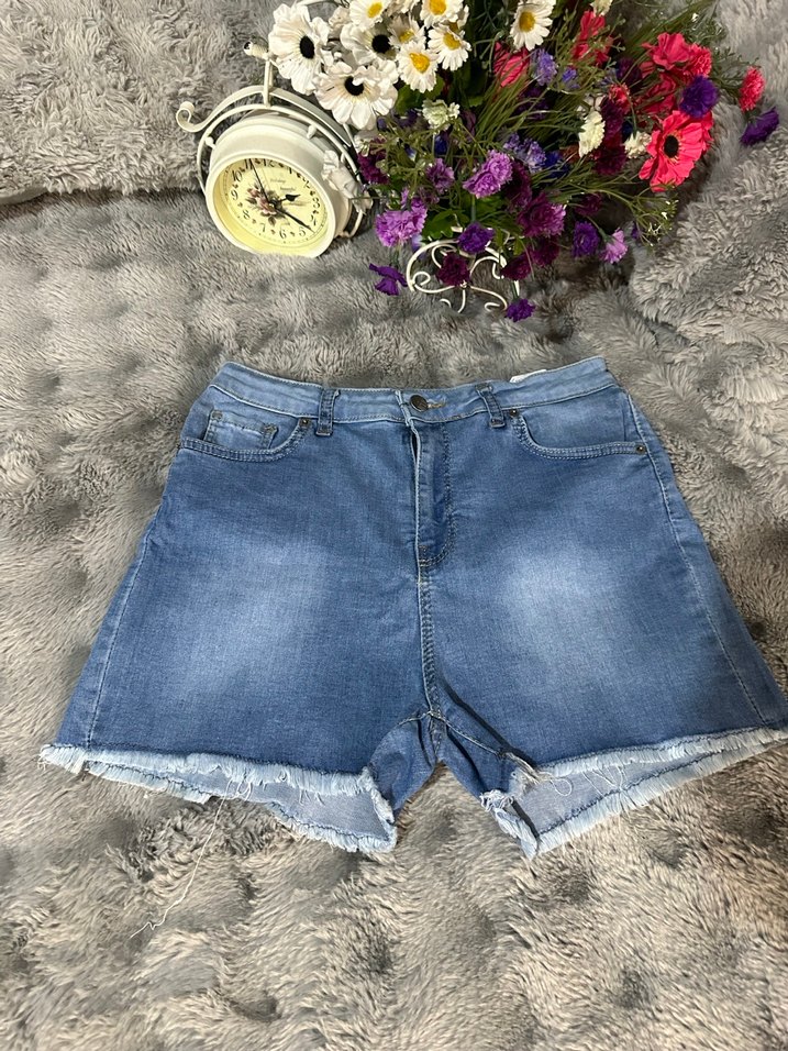Kadınlar için mavi kot şort, rahat kesim ve kısa boy. Yumuşak kürk detaylı, rahat ve trend sokak tarzına uygun.