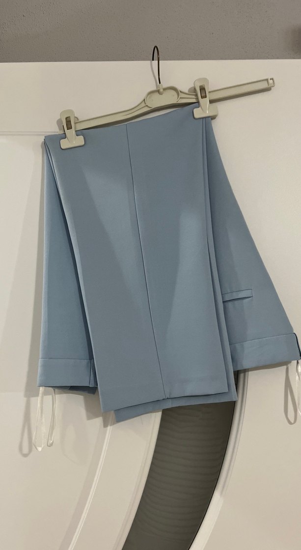 Kadınlar için düz mavi renkte, kısa boy ve regular fit kesimde, pile detaylı kumaş pantolon. Ofis kullanımı için uygundur.