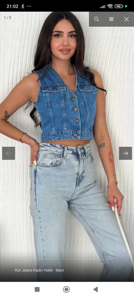 V yaka, düğmeli, kolsuz ve dar kesim mavi denim yelek. Hafif batik desenli, günlük kullanıma uygun sokak modası tarzında.