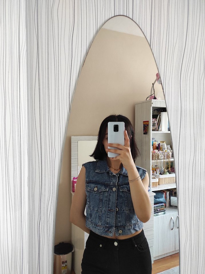 Bu dar kesim kadın kot yelek, açık gri batik desenli, askısız ve kolsuz tasarımıyla rahat sokak stili için uygundur.
