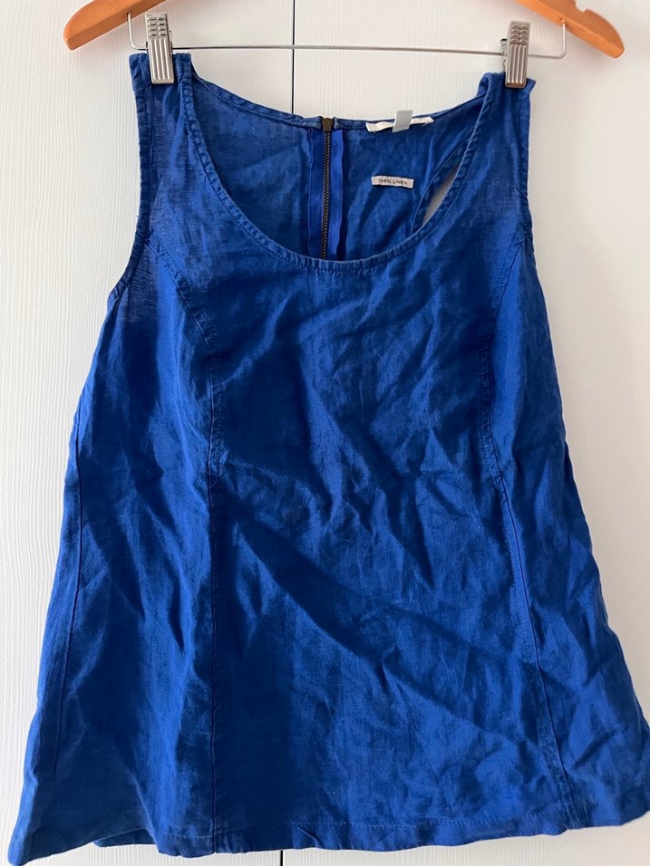 Mavi kolsuz keten bluz, tek renk ve parlak kumaştan. Salaş kesimli, tekne yaka ve normal midi boyda, arka fermuarlı.