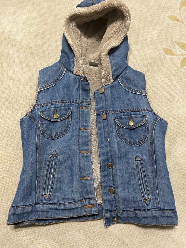 Kolsuz, kapüşonlu ve kürklü astarlı denim yelek. Düğmeli, fitted kesim ve normal boyda, günlük rahat stil için uygundur.