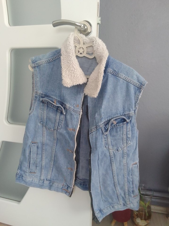 Kadın kolsuz denim ceket, bol kesim ve peluş detaylı yakaya sahiptir. Pastel mavi renkte, normal midi boyda, günlük rahat tarz için uygundur.