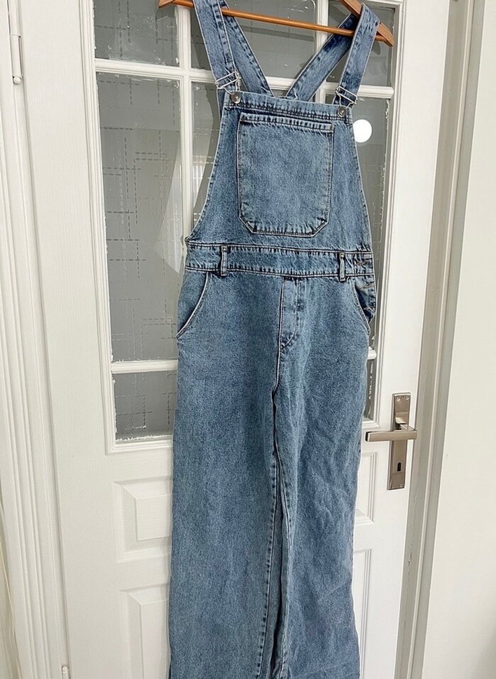 Kadınlar için kot tulum, askılı, bol kesim ve kemerli bel detayına sahiptir. Yaka tipi yuvarlak ve midi boyda, günlük rahat kullanıma uygundur. Mavi-gri renkte ve desensizdir.