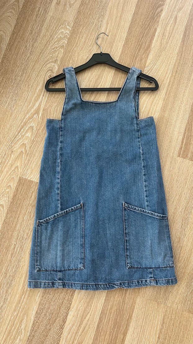 Askılı, kot kumaştan bol kesim elbise. Tokalı askıları ve iki ön cepleriyle günlük, bohem tarzda rahat bir modeldir.