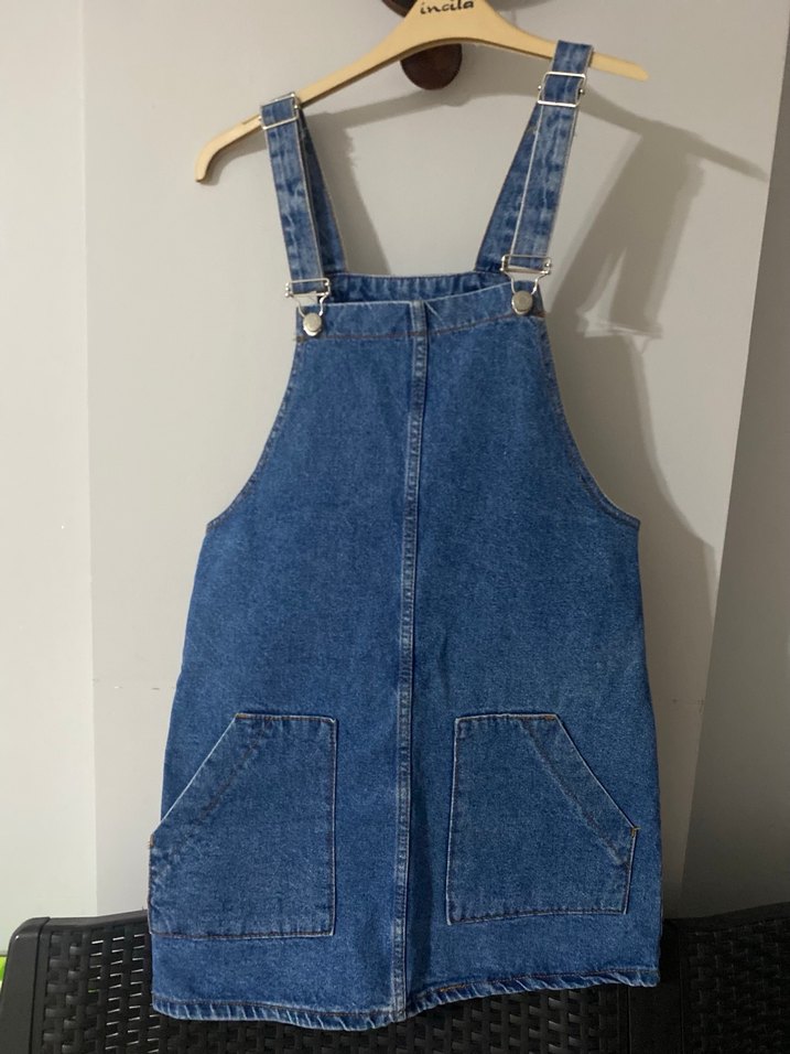 Kadınlar için mavi kot kumaştan, askılı ve tokalı, midi boy kısa salopet. İki ön cepli, günlük sokak stiline uygun rahat bir model. Pazarlık payı vardır.:)