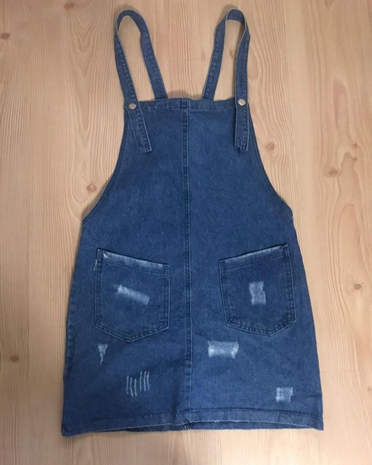 Bol kesim mavi kot askılı salopet elbise, tokalı askı ve ön ceplerle rahat günlük kullanım için uygundur. Kolsuz ve yuvarlak yaka.