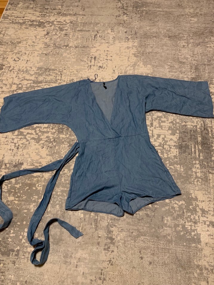 Kadın tulum, uzun kollu ve V yakalıdır. Yumuşak kot kumaştan, belden kuşaklı ve rahat bohem tarzdadır. Günlük kullanıma uygundur.
