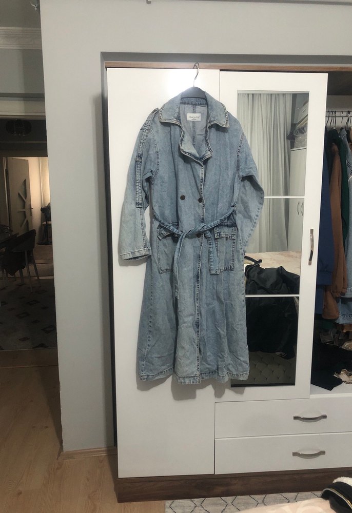 Gevşek kesim, kemerli mavi kot ceket, kesik yaka ve uzun kollu, günlük kullanım için rahat bir sokak tarzı sunar.