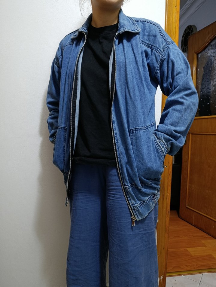 Kadın mavi kot ceket, rahat kesim, fermuarlı ve uzun kolludur. Notlu yaka ve diz boyu uzunluğuyla günlük kullanıma uygundur.
