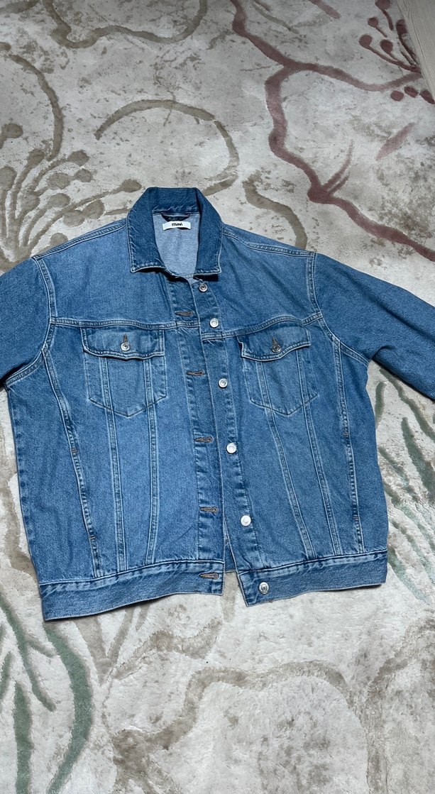 Kadın mavi kot ceket, düğmeli ön ve kesik yaka ile bol kesimdir. Uzun kollu, normal midi boyda, günlük rahat kullanım için uygundur.